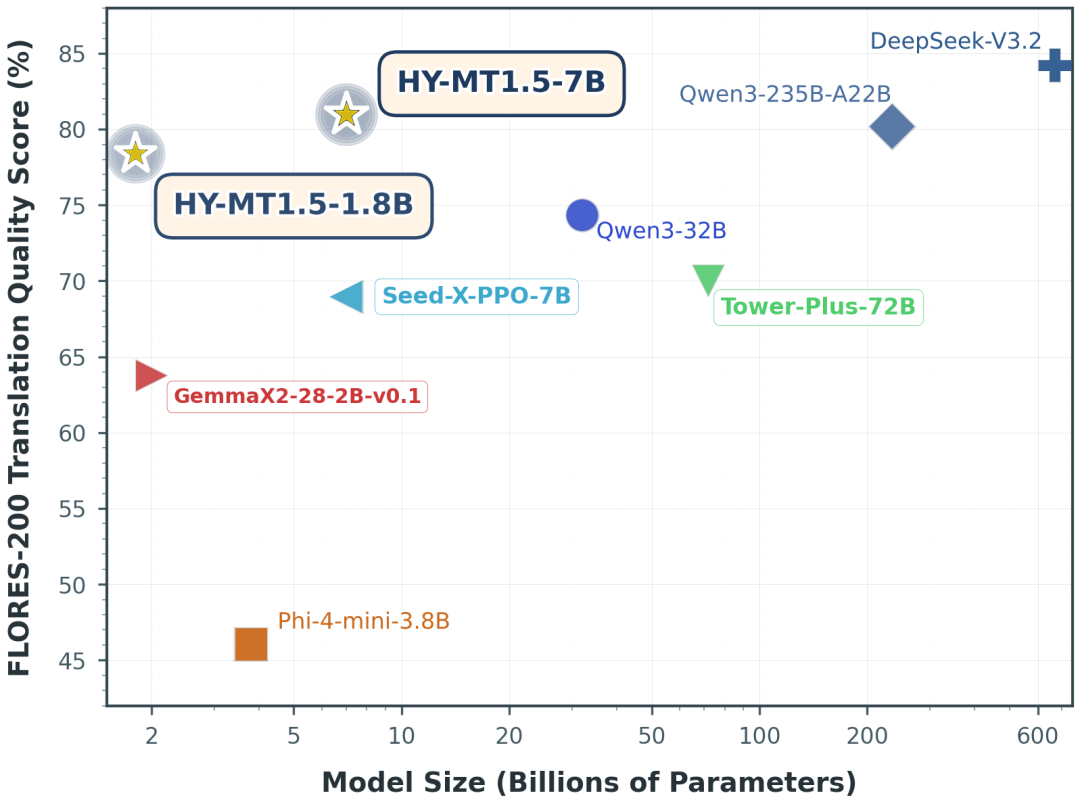 HY-MT1.5-1.8B 主要面向手机等消费级设备场景,经过量化,支持端侧直接部署和离线实时翻译,仅需 1GB 内存即可流畅运行,并且宣称在参数量极小的前提下,效果超过了大部分商用翻译 API。