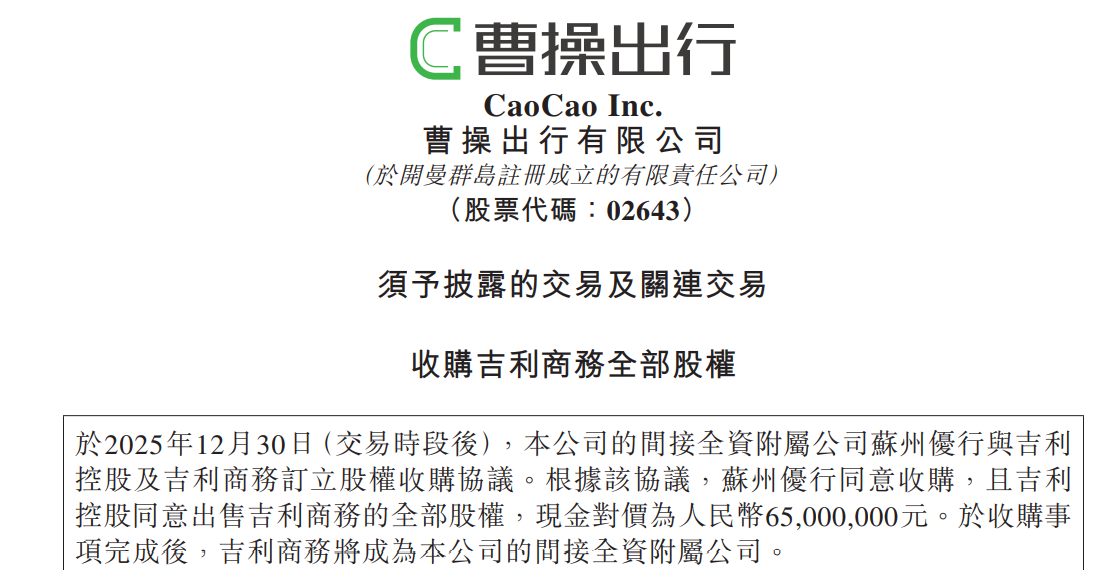 DoNews12月30日消息,12月30日,曹操出行宣布两项重要战略收购:收购蔚星科技有限公司(下称"耀出行")100%股权;拟收购浙江吉利商务服务有限公司(下称"吉利商旅")100%股权。