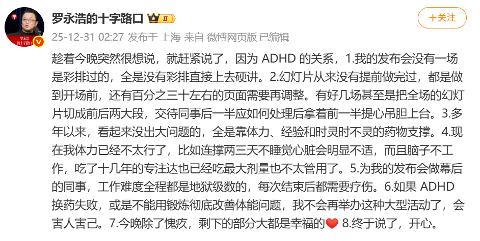 DoNews12月31日消息,今日凌晨,在十字路口之 2025 年度科技创新分享大会结束后,罗永浩在微博上表示,因为 ADHD(注意缺陷与多动障碍) 的关系,1.我的发布会没有一场是彩排过的,全是没有彩排直接上去硬讲。而且演讲幻灯片从来没有提前做完过,都是开场前还有30%页面需要再调整。
