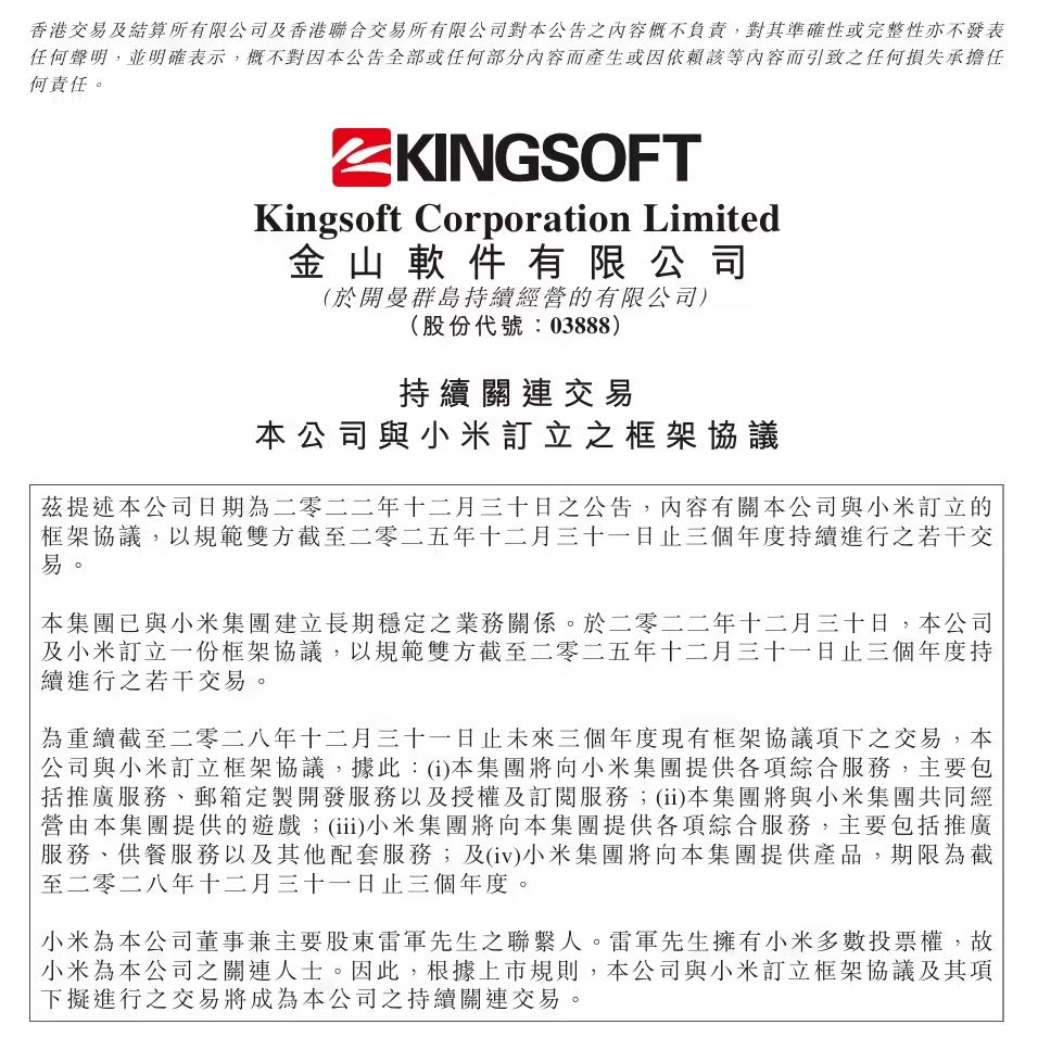 DoNews12月31日消息,金山软件今日发布公告,公司与小米签订新的框架协议,将现有合作关系延续至 2028 年 12 月 31 日。根据协议,金山软件集团将继续向小米集团提供综合服务,包括推广、邮箱定制开发、授权及订阅服务,并共同经营游戏。