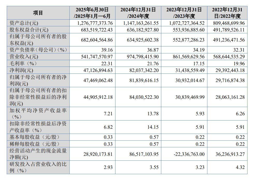 报告期内(2022年至2025年上半年),富士智能的营业收入分别为5.69亿元、8.62亿元、9.75亿元、5.42亿元;净利润分别为2939.24万元、3143.86万元、8203.73万元、4712.69万元。
