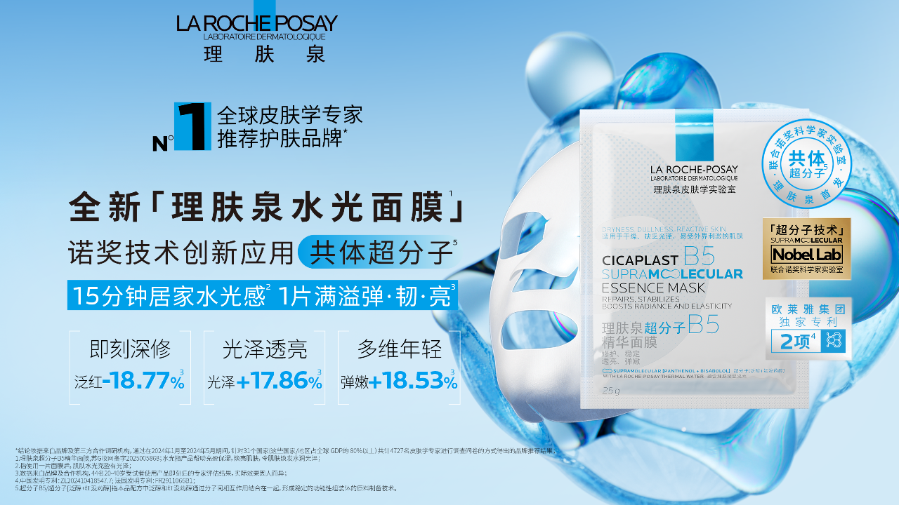 理肤泉水光面膜正是双方全新合作的首个重点产品。理肤泉水光面膜创新应用曾三次获得诺贝尔化学奖认可的超分子技术,通过超分子化学反应,生成新的分子间“榫卯”结构——共体超分子【B5+红没药醇】成分,突破单一成分功效天花板。