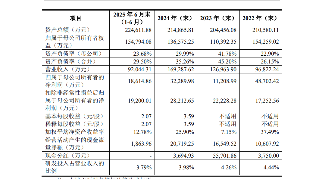 报告期内(2022年至2025年上半年),天博智能的营业收入分别为9.68亿元、12.7亿元、16.93亿元、9.2亿元;归母净利润分别为4.87亿元、1.12亿元、3.23亿元、1.86亿元。