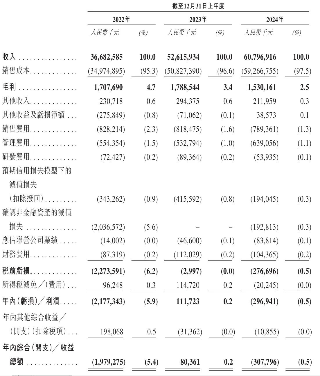 蓝标2022年、2023年、2024年年内利润分别为-21.77亿元、1.12亿元、-3亿元;年内利润率分别为-5.9%、0.2%、-0.5%。