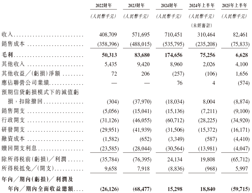 财务数据显示,在过去的2022年、2023年、2024年和2025年上半年,琥崧科技的营业收入分别为人民币4.09亿、5.72亿、7.10亿和0.82亿元,相应的净利润分别为人民币-2,612.6万、-6,847.7万、1,529.8万和-5,971.5万元,相应的经调整净利润分别为人民币183.0万、-3,718.1万、4,705.3万和-5,455.3万元。