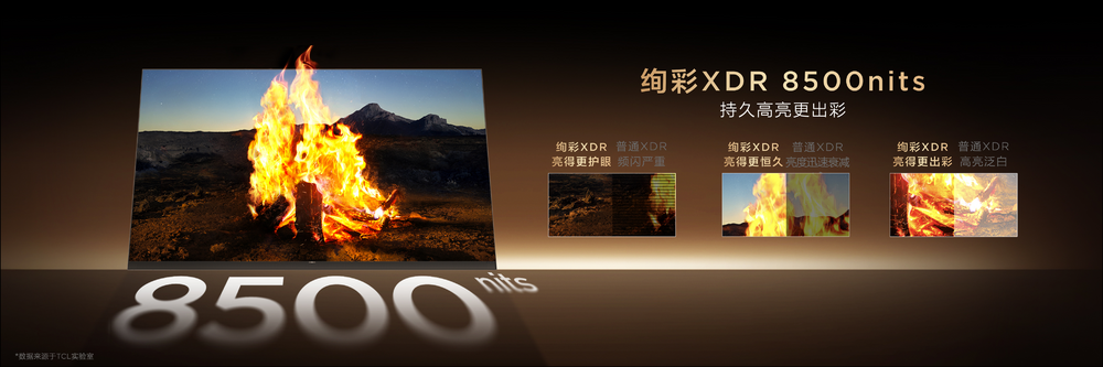 在峰值亮度技术方面,TCL Q10M Pro采用绚彩XDR,最高达8500nits的峰值亮度能让电视显示更多亮暗细节,色彩表现更加真实,画面更加通透。且峰值亮度持续时间远大于普通峰值亮度,实现了高亮不褪色,画面更出彩。