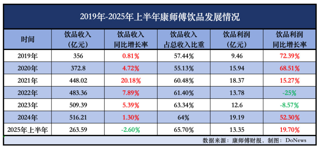 DoNews查询康师傅财报了解到,魏宏丞上任后的2019年-2024年,康师傅饮品业务的收入逐年提升,分别为356亿元、372.8亿元、448.02亿元、483.36亿元、509.39亿元和516.21亿元,在总收入中的占比分别为57.44%、55.13%、60.48%、61.40%、63.34%和64%;2025年上半年,康师傅饮品业务收入达到263.59亿元,占总收入的65.70%。