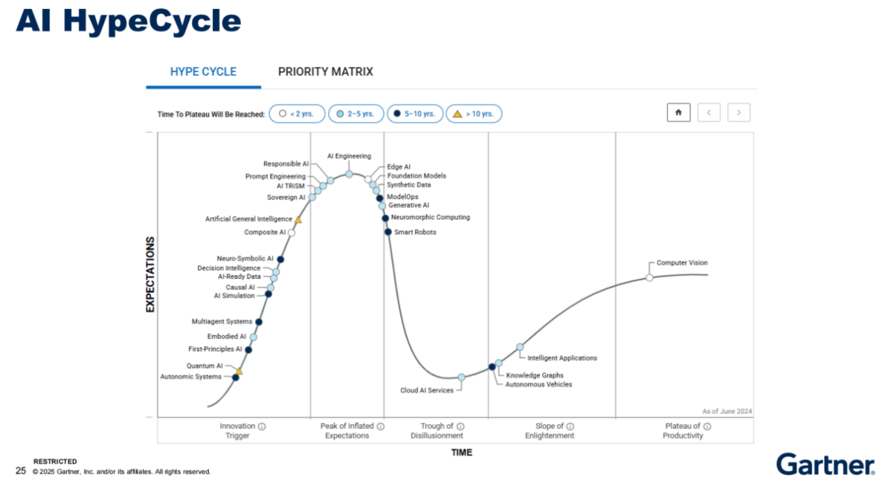 假如去看Gartner技术成熟度曲线,会发现一个普遍的趋势:一个产业要正常发展,不可避免要经历波峰波谷现象,从技术萌芽期、期望膨胀期、泡沫破裂低谷期,再到稳步爬升恢复期、生产成熟期,这是每个行业发展都存在的周期性。