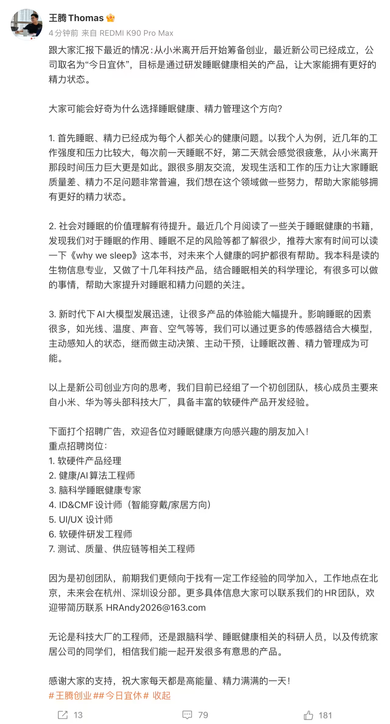 DoNews1月8日消息,今天上午,原小米中国区市场部总经理、REDMI 品牌总经理王腾在微博发文,汇报自己的近况。从博文中获悉,王腾目前正筹备创业,新公司也已成立,取名为“今日宜休”,目标是通过研发睡眠健康相关的产品,让大家能拥有更好的精力状态。