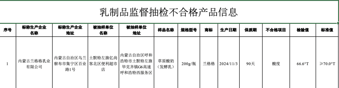 根据不合格信息详情,该批次不合格的产品为内蒙古自治区呼和浩特市土默特左旗亿尚客北区便利超市店销售的、标称内蒙古兰格格乳业有限公司生产的草原酸奶(发酵乳),该产品生产日期为2024年11月3日,保质期90天、规格为200g/瓶,其中酸度检验结果为66.6°T,标准规定为不得小于70.0°T,不符合食品安全国家标准规定。