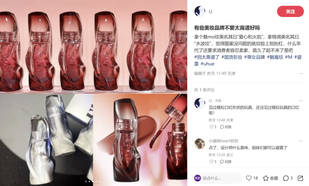 但在消费者的直观感受中,这款唇釉的瓶身曲线轮廓却引发了强烈的性化联想,被部分网友认为酷似男性生殖器;配套包装上的复杂纹路,又被关联到带有情色隐喻的“魅魔纹”,进一步激化了“辱女”的质疑。