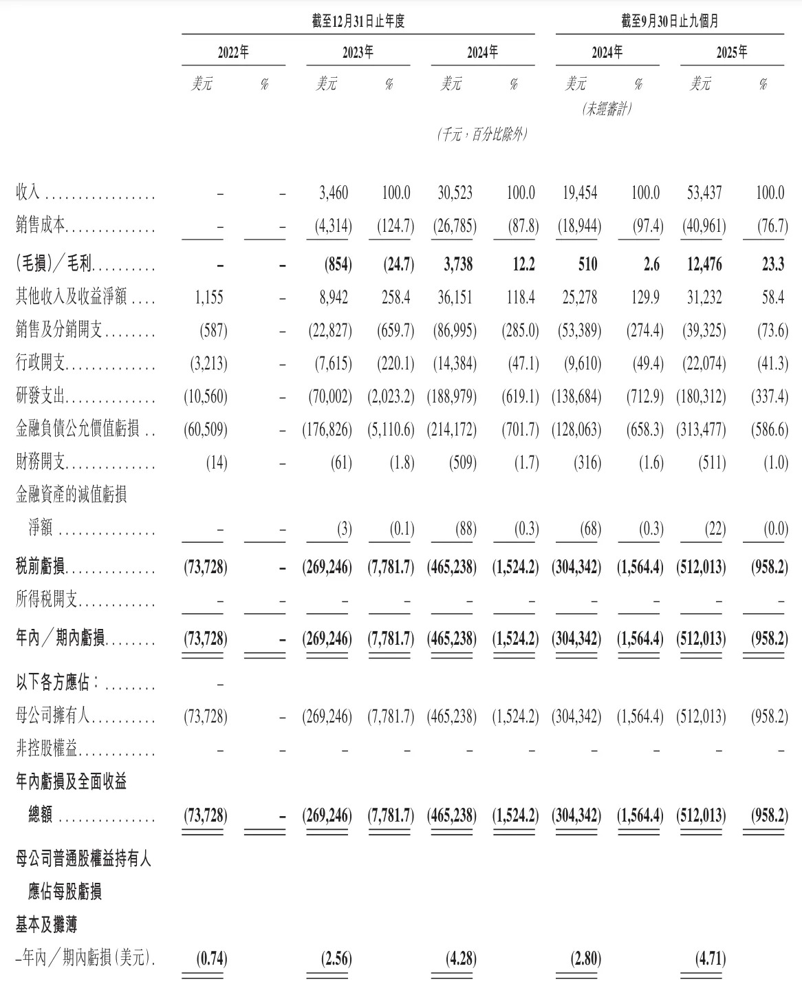 招股书显示,MiniMax在2023年营收为346万美元,2024年营收为3052万美元;2025年前9个月营收为5343.7万美元(约3.76亿元),较上年同期的1945万美元增长175%。
