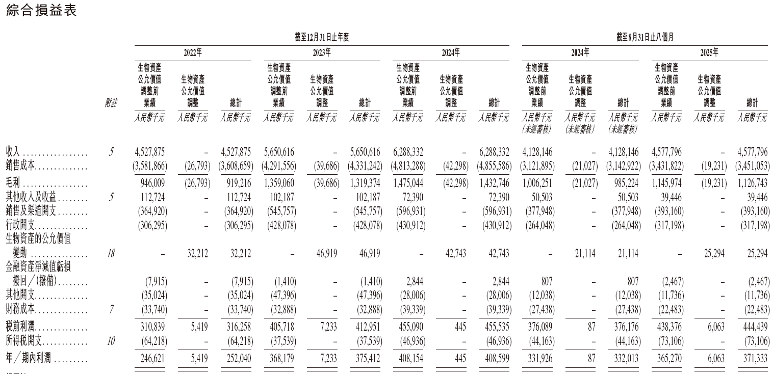 招股书显示,在过去的2022年、2023年、2024年和2025年前八个月,老乡鸡的营业收入分别为人民币45.28亿、56.51亿、62.88亿和45.78亿元,相应的净利润分别为人民币2.52亿、3.75亿、4.09亿和3.71亿元。
