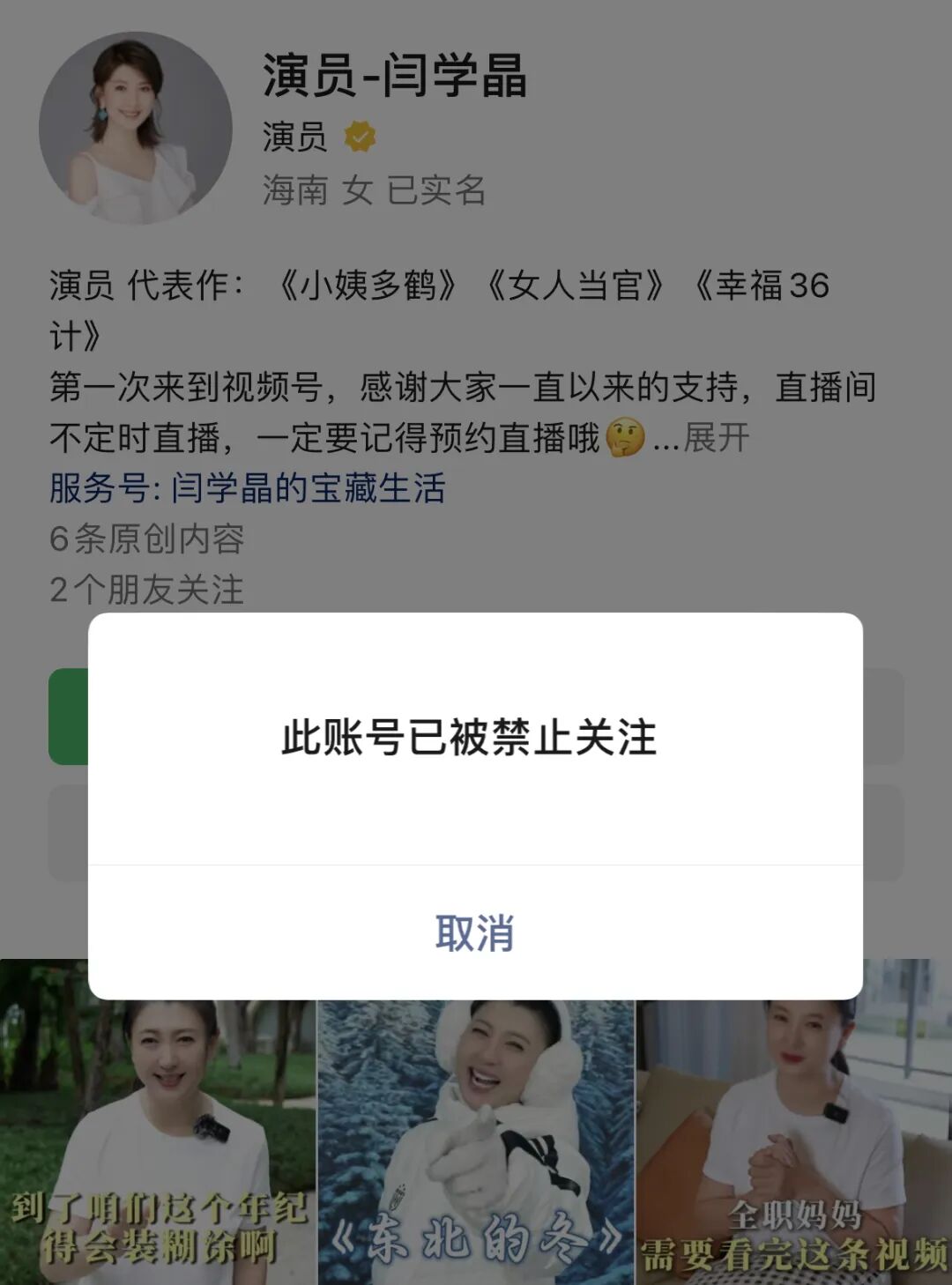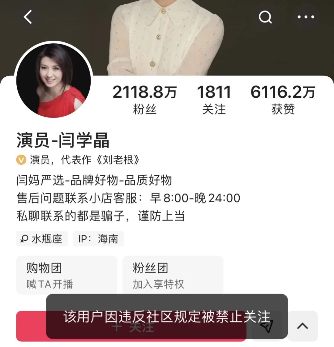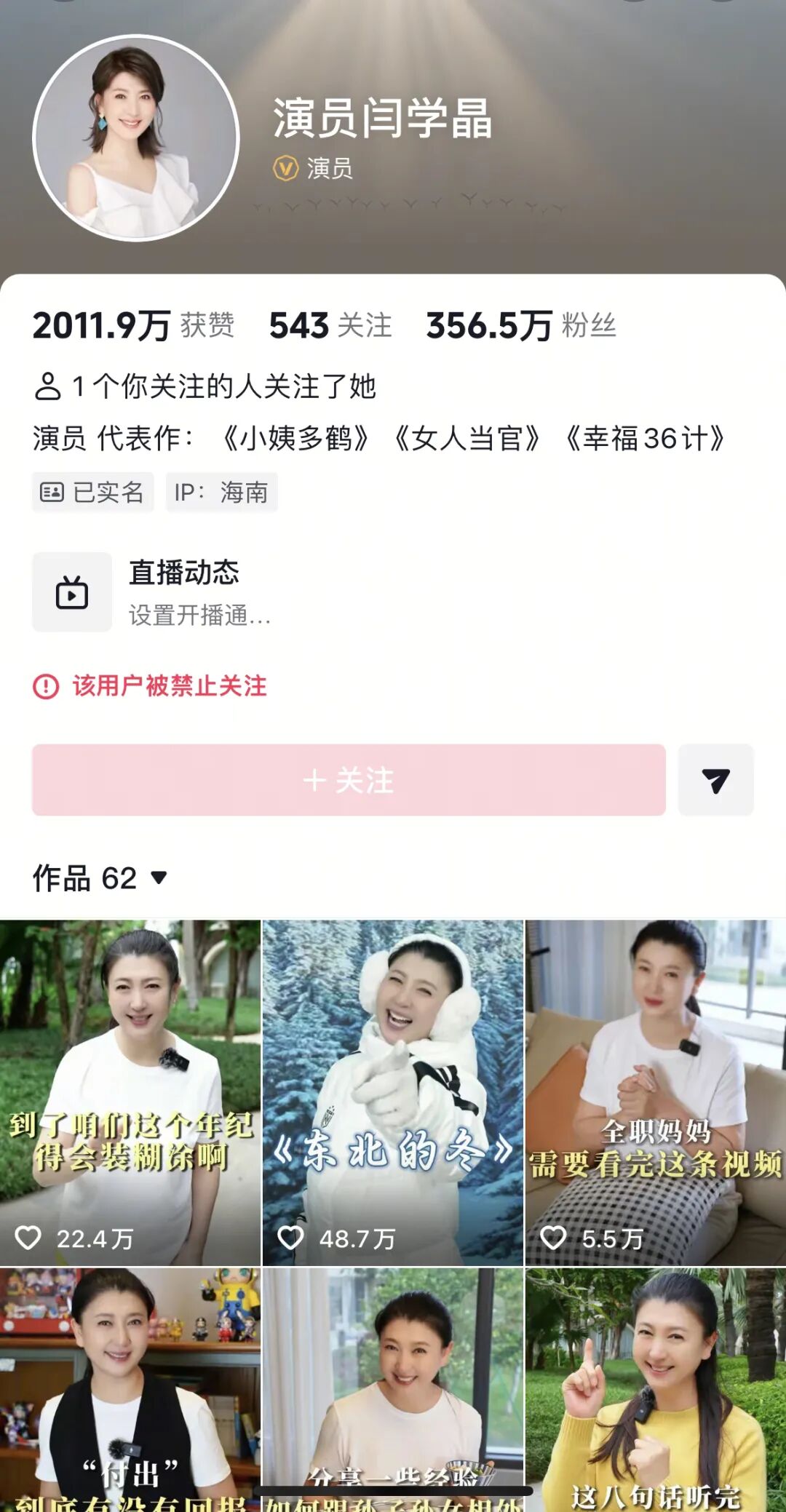 抖音平台显示,其有三百多万粉丝,目前已被禁止关注。其在快手拥有两千多万粉丝,目前显示因违反社区规定被禁止关注。此外,闫学晶视频号也显示被禁止关注。