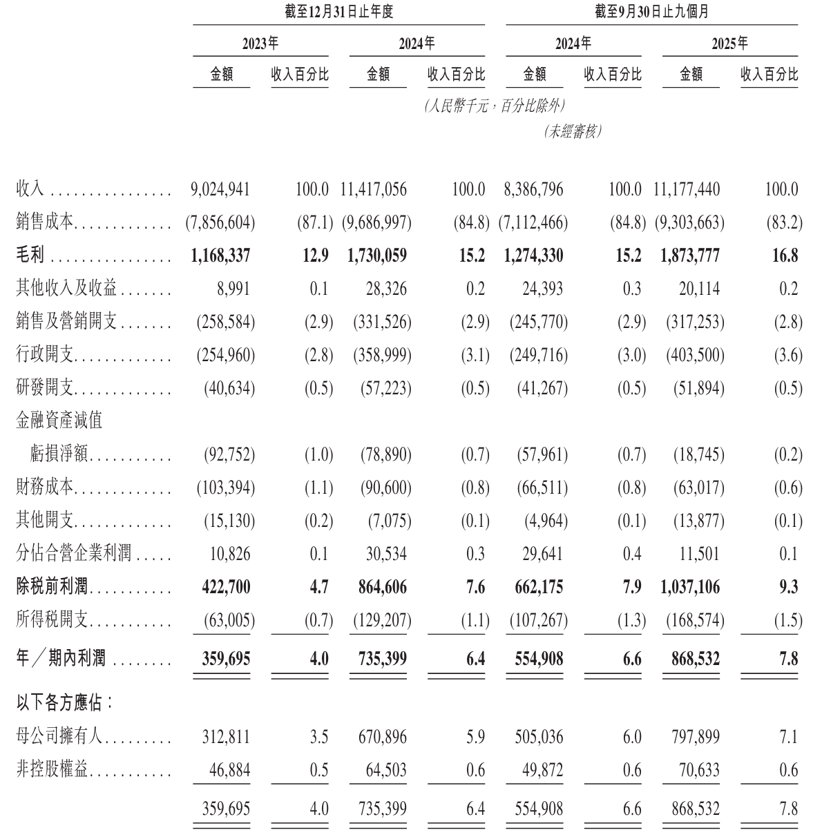 海大国际2025年前9个月营收为111.77亿元,毛利为18.74亿元,期内利润为8.69亿元,期内利润率为7.8%。