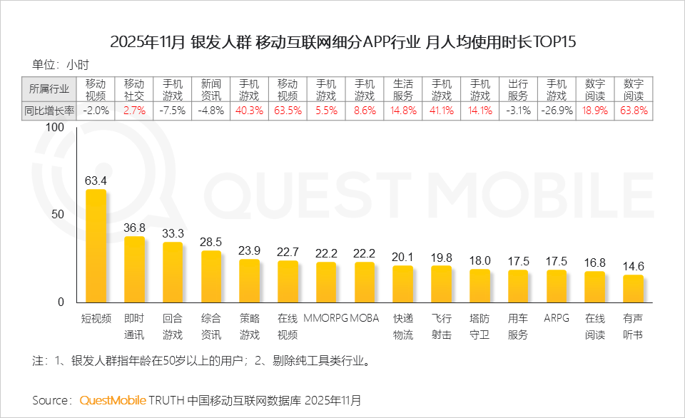 QuestMobile数据显示,2025年11月,银发人群月人均使用时长135小时,同比提升11.1%,月人均使用次数为1345次,同比提升6.5%。