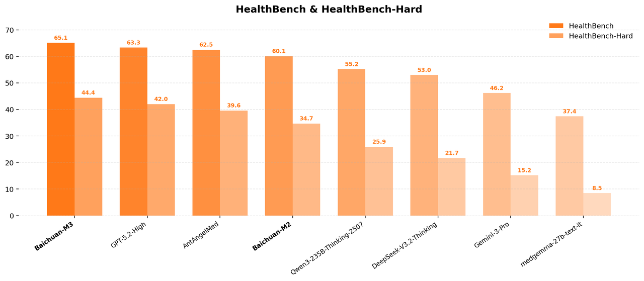 DoNews1月13日消息,百川智能在今日举办的媒体沟通会上正式发布了其新一代开源医疗增强大语言模型 Baichuan-M3。据介绍,该模型在问诊能力、医疗幻觉控制以及 Healthbench 和 Healthbench Hard 评测中均排名第一,不仅超越了 OpenAI GPT-5.2,还在所有测试环节中超越了人类医生的表现。