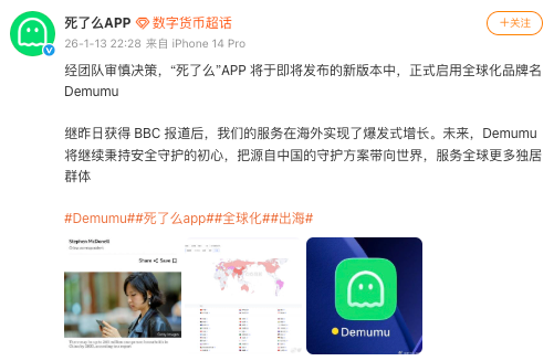 DoNews1月13日消息,1月13日晚间,@死了么APP在微博发文称,经团队审慎决策,“死了么”APP将于即将发布的新版本中,正式启用全球化品牌名Demumu,“继昨日获得BBC报道后,我们的服务在海外实现了爆发式增长。未来,Demumu将继续秉持安全守护的初心,把源自中国的守护方案带向世界,服务全球更多独居群体。”