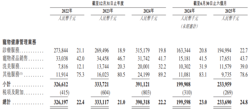 具体来看,2022年至2025年上半年(简称“报告期”),公司约90%的收入来自诊疗服务,还有小部分收入来自宠物产品销售、洗美服务、宠物留观服务等业务。