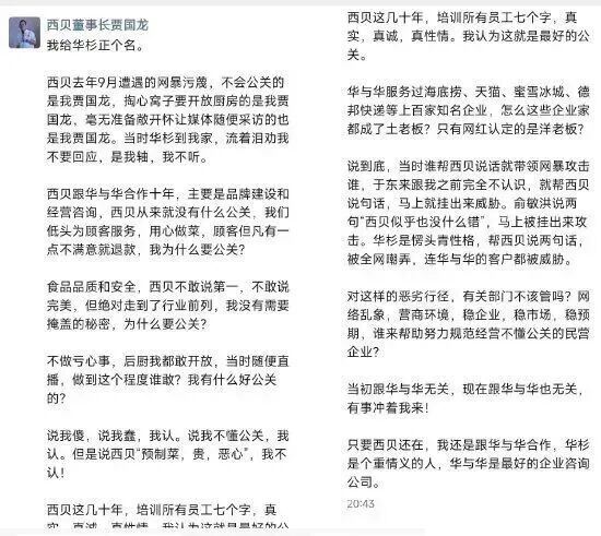 对此,贾国龙质疑此类恶劣行径,呼吁相关部门出手规范,以改善网络乱象,优化营商环境。贾国龙强调,西贝此番身陷网暴风波,根源在于自身不擅长公关工作,与合作方华与华并无关联。