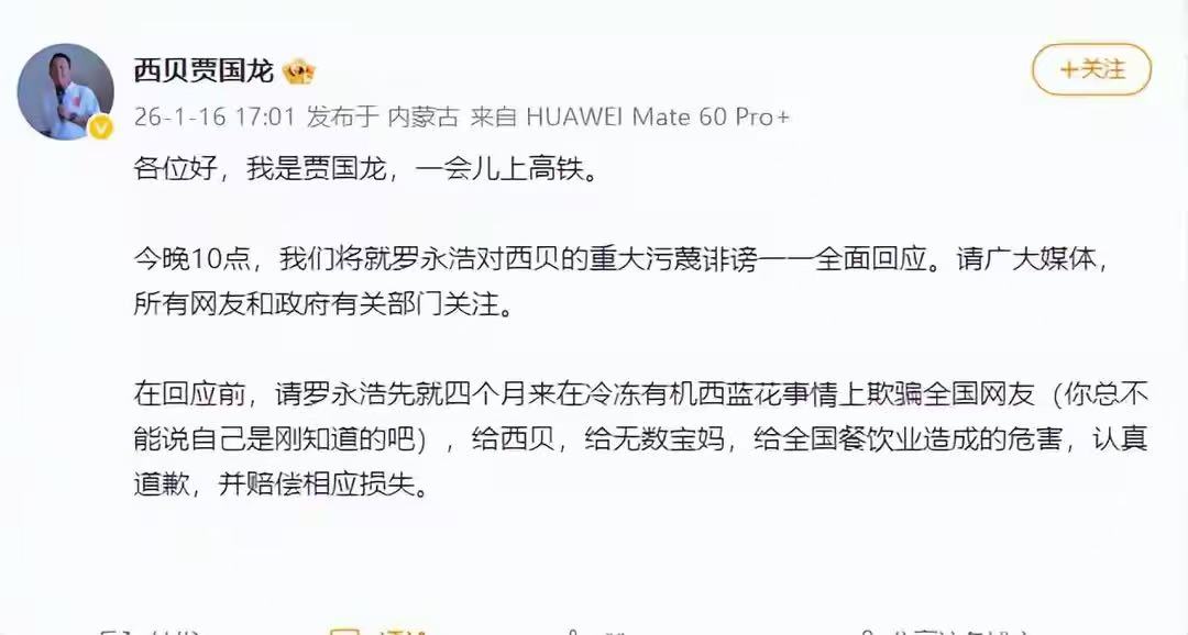 DoNews1月16日消息,西贝创始人贾国龙今日发微博表示:各位好,我是贾国龙,一会儿上高铁。今晚10点,我们将就罗永浩对西贝的重大污蔑诽谤一一全面回应。请广大媒体,所有网友和政府有关部门关注。