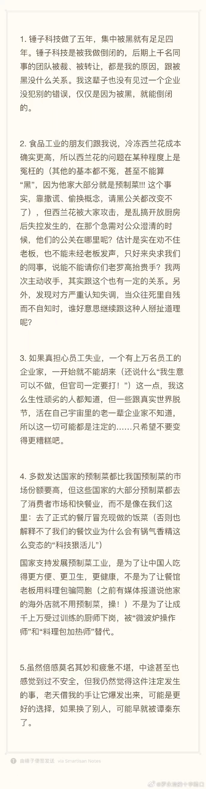 在回应前,请罗永浩先就四个月来在冷冻有机西蓝花事情上欺骗全国网友(你总不能说自己是刚知道的吧),给西贝,给无数宝妈,给全国餐饮业造成的危害,认真道歉,并赔偿相应损失。