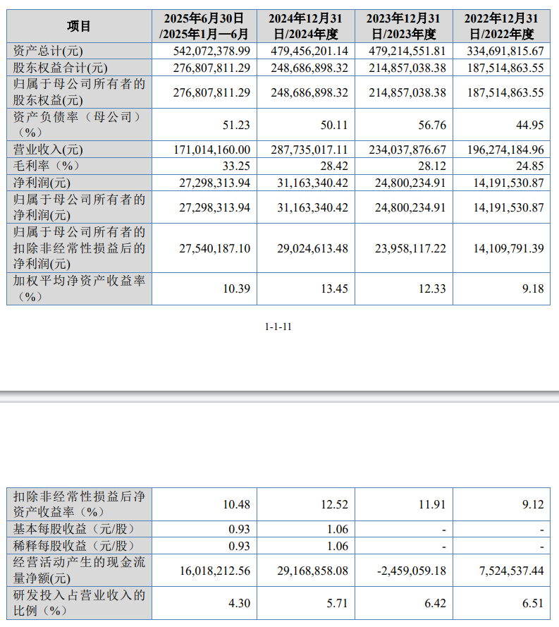 报告期内(2022年至2025年上半年),元立光电的营业收入分别为1.96亿元、2.34亿元、2.88亿元、1.71亿元;净利润分别为1419.15万元、2480.02万元、3116.33万元、2729.83万元。