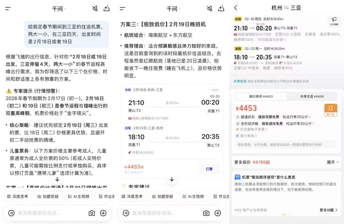 更复杂一些的操作也可以,比如像聊天一样说“想给爸妈家买个扫地机器人,预算2000到4000,家里还有只猫”,千问App就能推理出“防缠绕”、“高温杀菌”的需求,并给出合适的商品;准备春节出游,千问App一边调用飞猪来预定机票和酒店,一边调用高德来做行程规划和预定年夜饭,甚至直接打电话订餐厅。