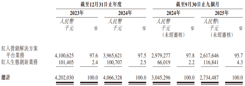 天下秀的收入主要来自红人营销解决方案平台,2023年、2024年、2025年1-9月(简称“报告期”),该业务为公司贡献了95%以上的收入,还有小部分收入来自红人生态创新业务。