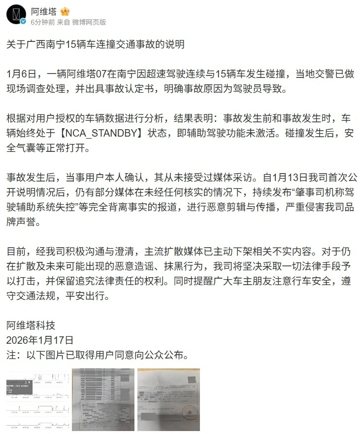 DoNews1月17日消息,阿维塔今晚发布“关于广西南宁 15 辆车连撞交通事故的说明”。1 月 6 日,一辆阿维塔 07 在南宁因超速驾驶连续与 15 辆车发生碰撞,当地交警已做现场调查处理,并出具事故认定书,明确事故原因为驾驶员导致。