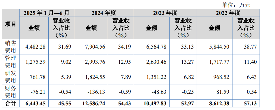 报告期内,公司期间费用总额分别为8,612.38万元、10,497.83万元、12,586.74万元和6,443.45万元,占营业收入的比重分别为57.13%、52.97%、54.43%和45.55%。公司经过前期多年的研发积累及市场推广,多项产品上市并实现收入的快速增长,公司期间费用总额亦有所增长,报告期内总体期间费用率较为稳定。