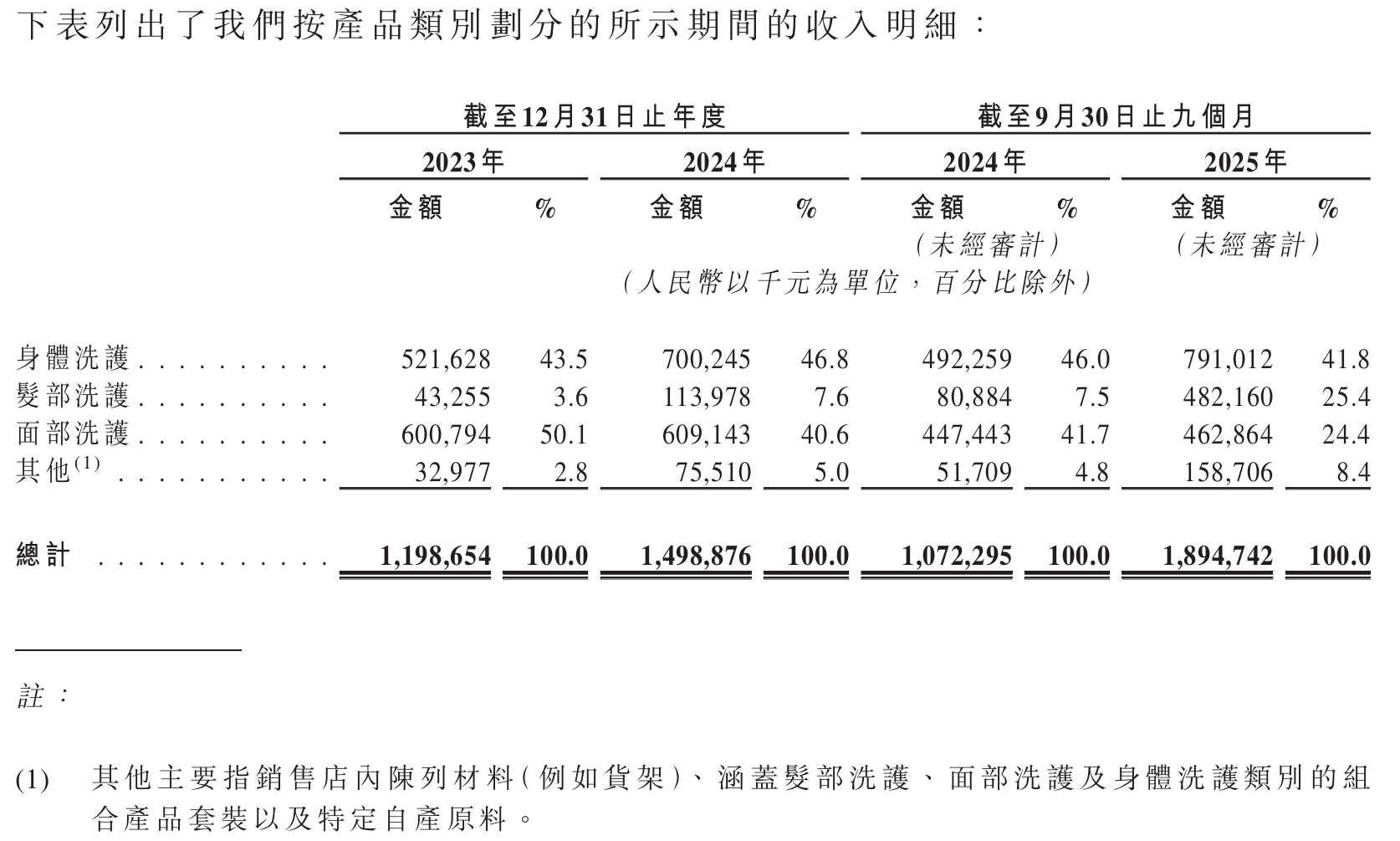 2025年前三季度,半亩花田的发部洗护品类收入达到4.82亿元,同比增长496.1%,成为第二增长曲线;同期,在旗舰洁面慕斯的带动下,其面部洗护品类产生4.63亿元的收入。美白身体乳自推出起至2025年9月30日已累计销售约800万瓶,鲜花花萃系列洗发水累计销售约810万瓶。