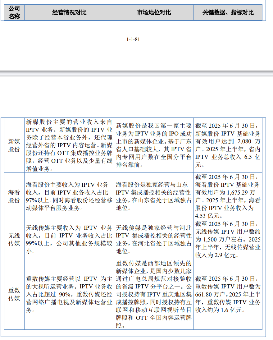 重数传媒的主营业务是以IPTV为主的大视听运营业务及网络广播电视台业务,并向高清超高清应用、线上线下融合应用、5G物联网人工智能应用方向拓展。