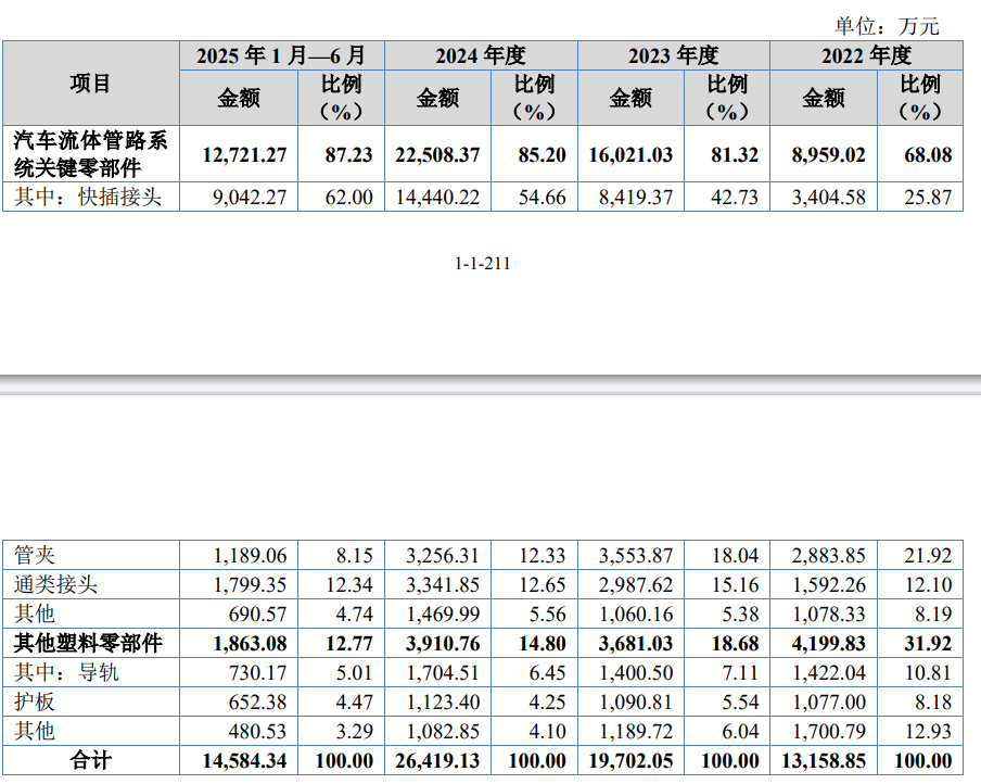报告期各期,公司主营业务收入分别为13,158.85万元、19,702.05万元、26,419.13万元及14,584.34万元,增长较快。其中,公司汽车流体管路系统关键零部件产品的销售收入分别为8,959.02万元、16,021.03万元、22,508.37万元及12,721.27万元。2023年及2024年,公司关键零部件产品的销售收入分别增长了7,062.01万元及6,487.34万元,增幅分别为78.83%及40.49%,为主营业务收入中的主要增长来源。