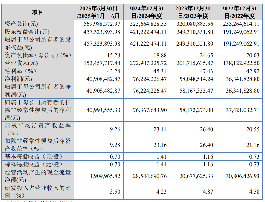 报告期内(2022年至2025年上半年),弥富科技的营业收入分别为1.38亿元、2.02亿元、2.73亿元、1.52亿元;净利润分别为3634.18万元、5804.85万元、7622.42万元、4090.85万元。