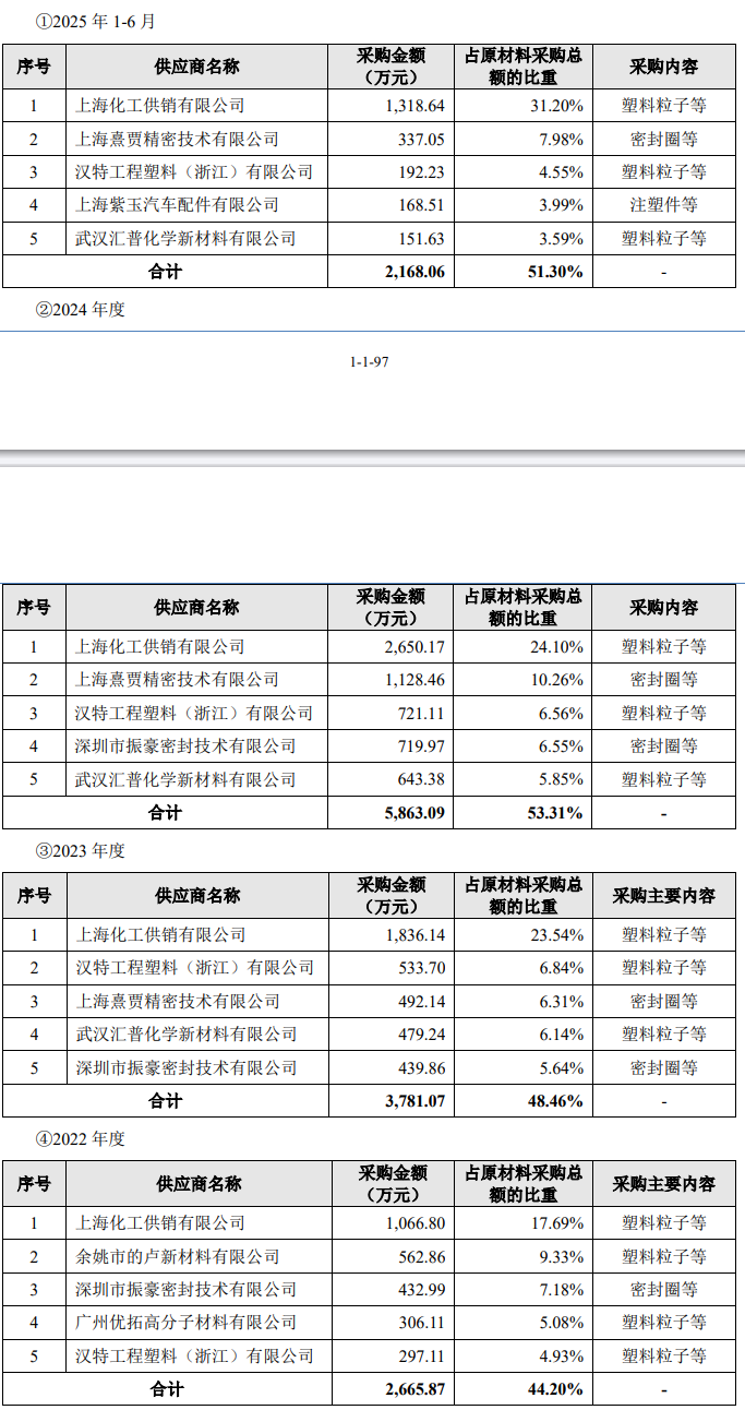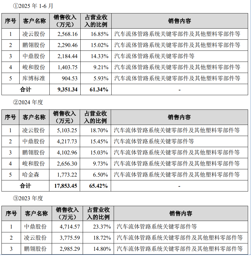 报告期各期,公司前五大客户的销售收入占营业收入的比重分别为69.01%、69.60%、65.42%及61.34%。2024年6月,公司召开2024年第三次临时股东大会,引入机构投资者,其中嘉兴颀景持股比例为6.93%,鹏翎股份作为有限合伙人通过嘉兴颀景间接持有公司6.61%股份,持有公司股份超过百分之五,鹏翎股份构成公司关联方,2023年度、2024年度及2025年1-6月公司与鹏翎股份之间的交易构成关联交易。除此之外,公司董事、原监事、高级管理人员、核心技术人员及其关联方或持有公司5%以上股份的股东不存在在上述主要客户中持有权益的情形。