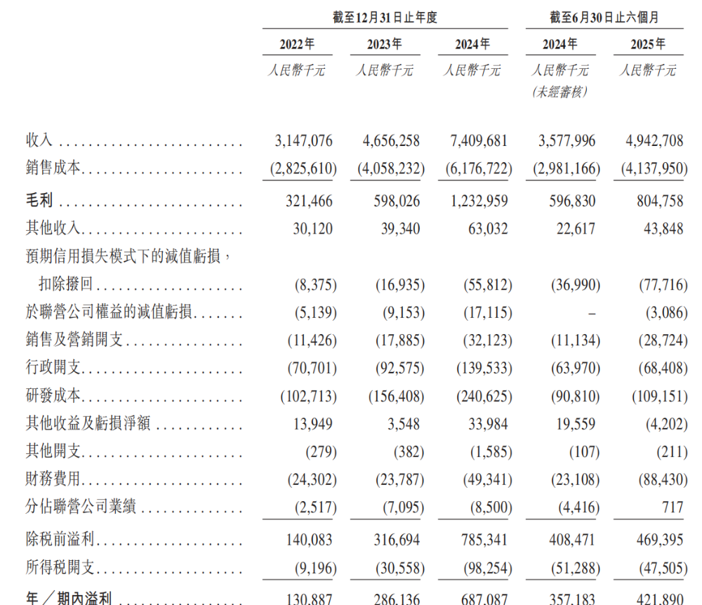 于2022财年、2023财年、2024财年及2025年首六个月的毛利分别为人民币321.5百万元、人民币598.0百万元、人民币1,233.0百万元及人民币804.8百万元,同期的毛利率分别为10.2%、12.8%、16.6%及16.3%。净利润分别为人民币130.9百万元、人民币286.1百万元、人民币687.1百万元及人民币421.9百万元。