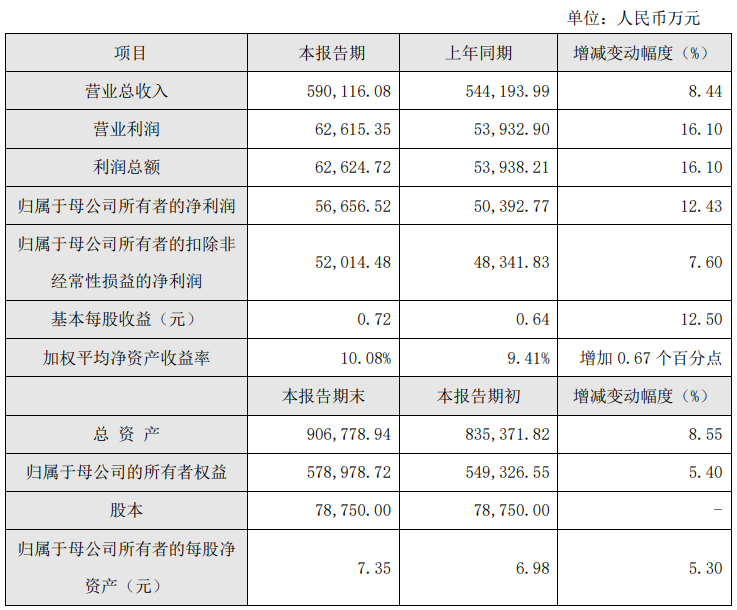 报告期末,公司总资产906,778.94万元,较报告期初增长8.55%;归属于母公司的所有者权益578,978.72万元,较报告期初增长5.4%。