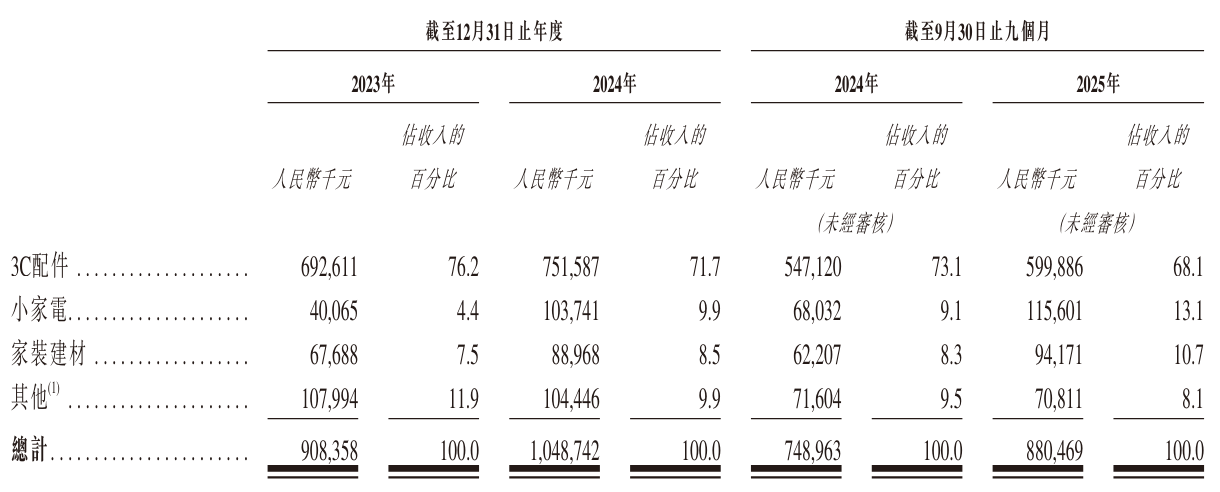 沃客非凡2025年前9个月来自3C配件的收入6亿,占比为68.1%;来自小家电收入1.16亿,占比13.1%;来自家装建材收入9417万,占比为10.7%。