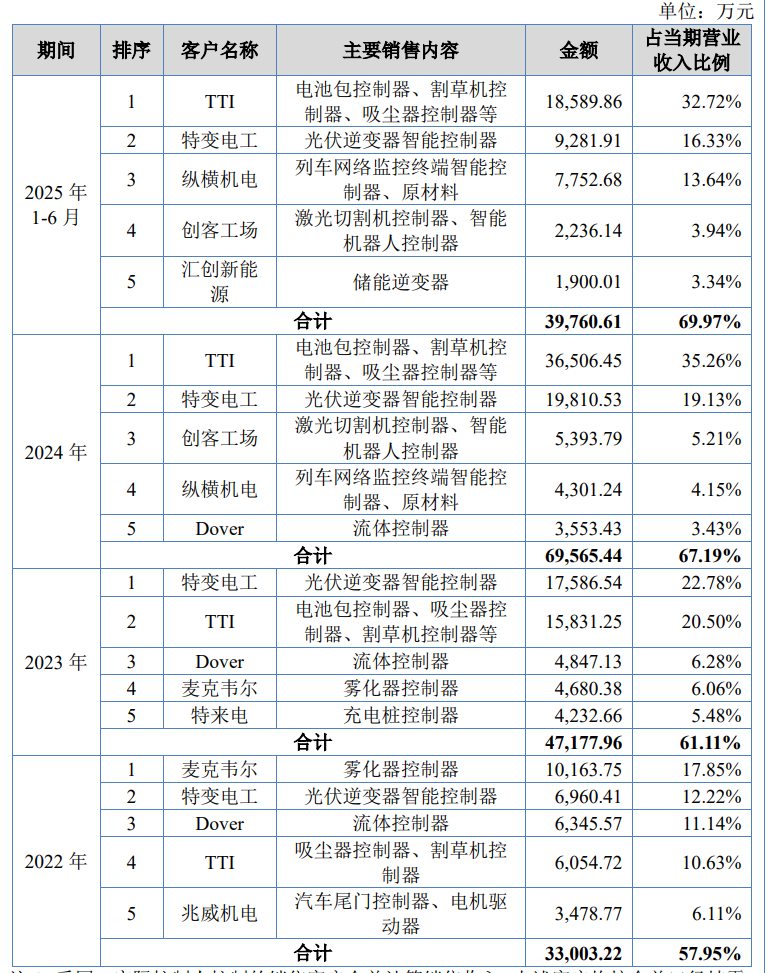 报告期内,公司向前五大客户销售额占比分别为57.95%、61.11%、67.19%、69.97%,客户集中度相对较高,与智能控制器行业上市公司和而泰、朗科智能客户集中度相似,符合所处行业特性。