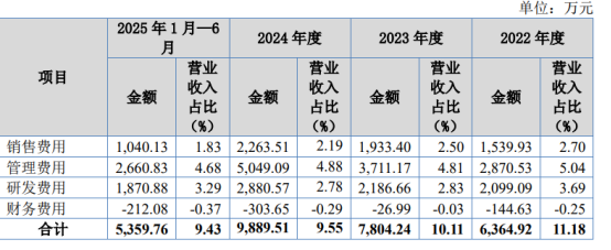 报告期内,公司管理费用分别为2,870.53万元、3,711.17万元、5,049.09万元及2,660.83万元,占营业收入的比例分别为5.04%、4.81%、4.88%及4.68%。报告期内,公司管理费用率与同行业可比公司平均水平趋同,符合行业经营特征。