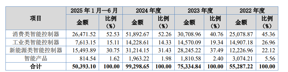 报告期内,公司消费类智能控制器实现销售收入分别为25,078.87万元、30,708.96万元、51,892.67万元及26,471.52万元,占主营业务收入比例分别为45.36%、40.76%、52.26%及52.53%,占比较高,是公司营业收入的主要组成部分。