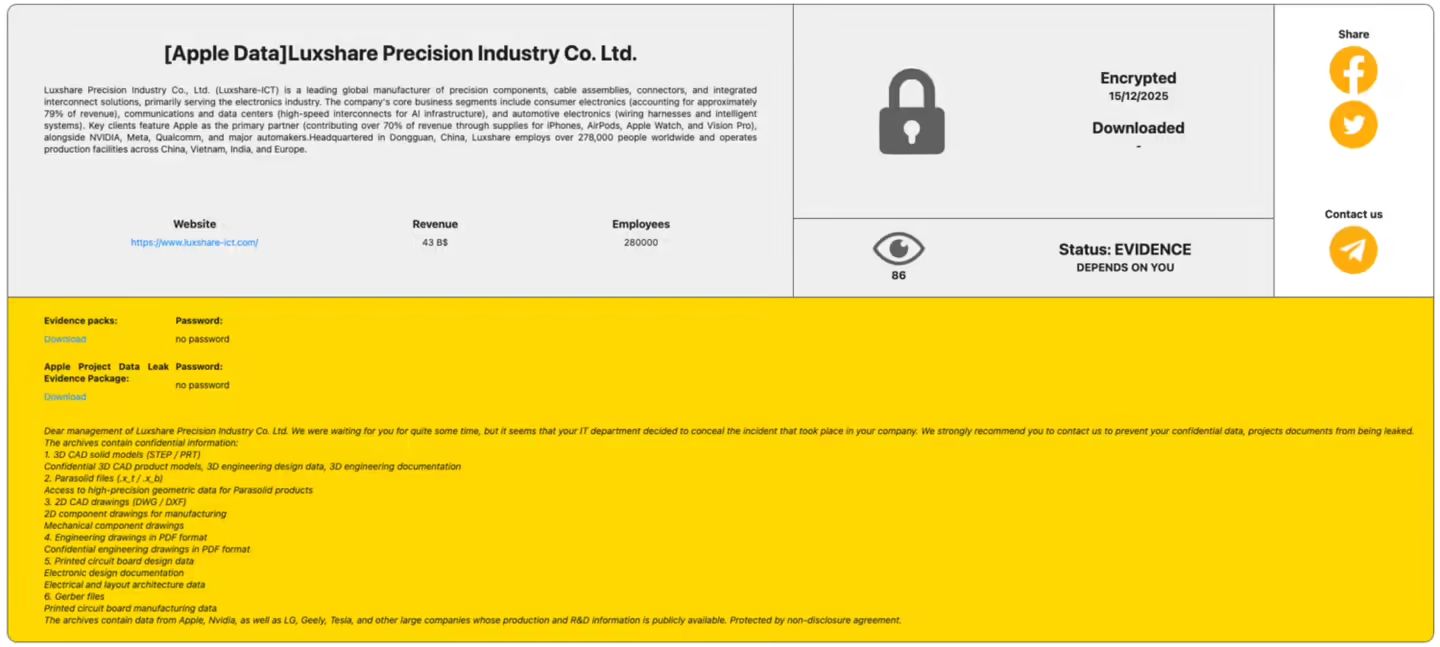 DoNews1月22日消息,据IT之家援引国外科技媒体 CyberNews 报道,称苹果核心代工厂立讯精密(Luxshare)遭勒索软件组织 RansomHub 攻击,包括苹果、英伟达、特斯拉及 LG 在内的多家科技巨头机密数据面临泄露风险。