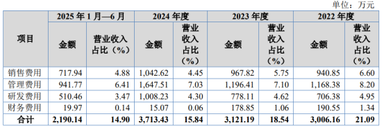 报告期各期,公司期间费用合计分别为3,006.16万元、3,121.19万元、3,713.43万元和2,190.14万元,占营业收入的比例分别为21.09%、18.54%、15.84%和14.90%,随着公司营业收入规模的增加,期间费用占比有所下降。