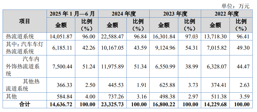 报告期各期,公司主营业务收入分别为14,229.68万元、16,800.22万元、23,325.73万元和14,636.72万元,保持持续稳定增长。报告期内,公司主要产品为热流道系统,该产品收入占比超过95%,系公司主营业务收入的主要来源。