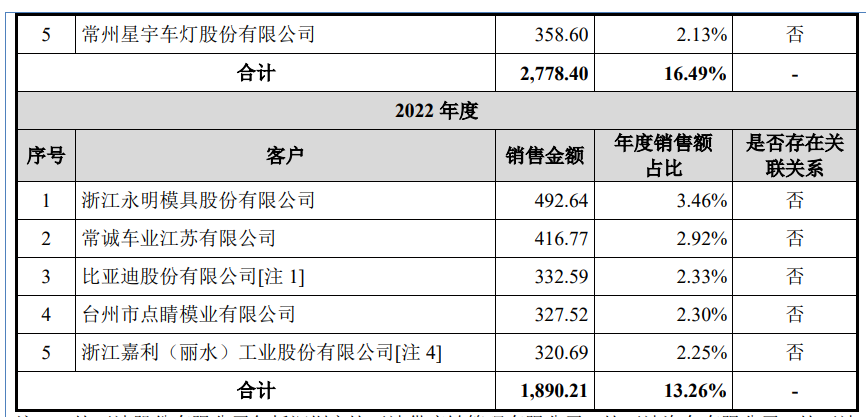 报告期各期,公司前五名客户合计收入金额分别为1,890.21万元、2,778.40万元、4,218.24万元和3,116.66万元,占营业收入的比重分别为13.26%、16.49%、17.99%和21.20%。公司前五名客户主要系汽车主机厂、汽车零部件厂和注塑模具厂等,公司与主要客户维持了良好的合作关系。