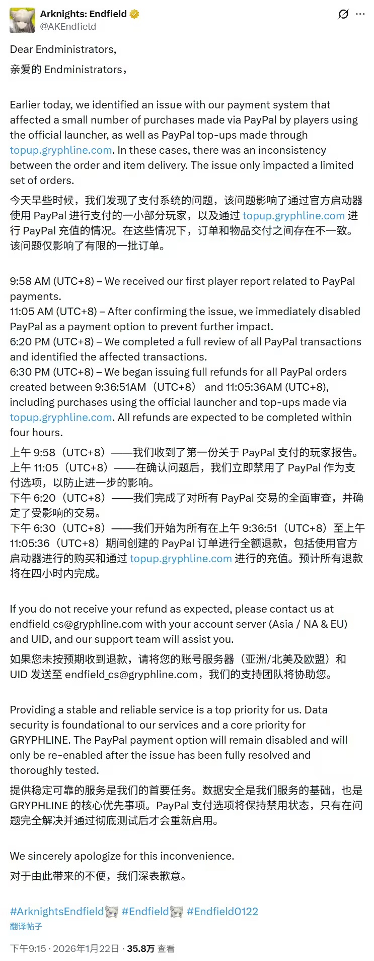 《明日方舟:终末地》官方 X 账号公告称,当日发现了支付系统的问题,该问题影响通过官方启动器使用 PayPal 进行支付的一小部分玩家,以及通过 topup.gryphline.com 进行 PayPal 充值的情况。