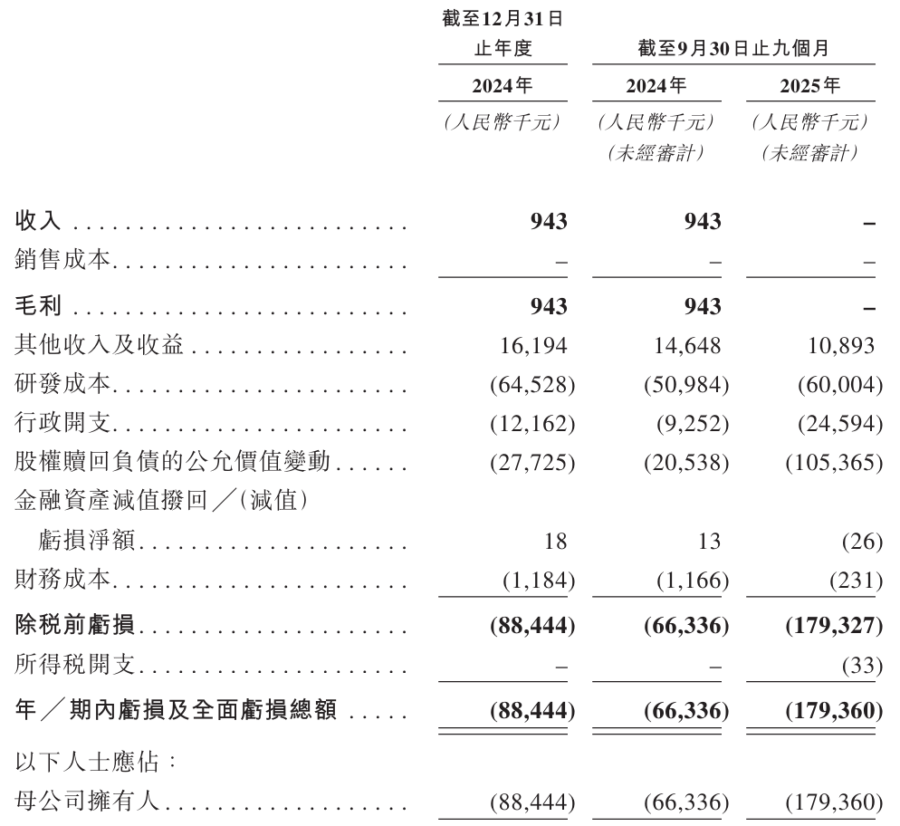 招股书显示,邦顺制药2024年营收为94万元,期内亏损为8844万元;2025年前9个月无营收,期内亏损为1.79亿元。