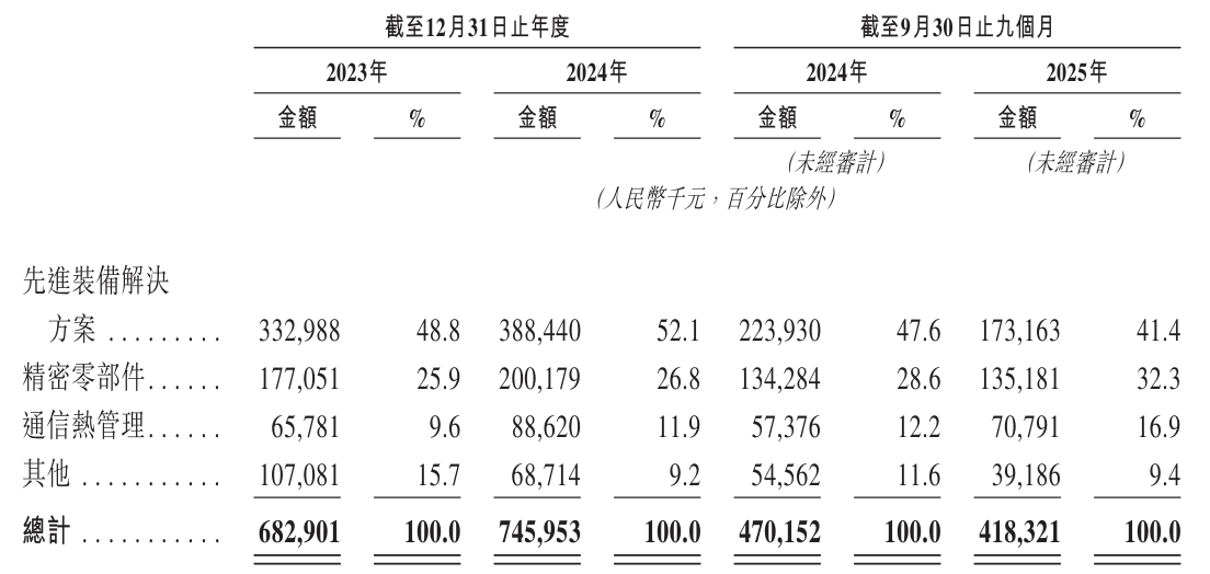 精智实业2025年前9个月营收为4.18亿,毛利为8321万元,期内利润为1067万元。精智实业2025年前9个月来自先进装备解决方案收入1.73亿,占比41.4%;来自精密零部件收入1.35亿,占比32.3%;来自通信热管理收入为7079万元,占比为16.9%;来自其他收入为3919万元,占比为9.4%。