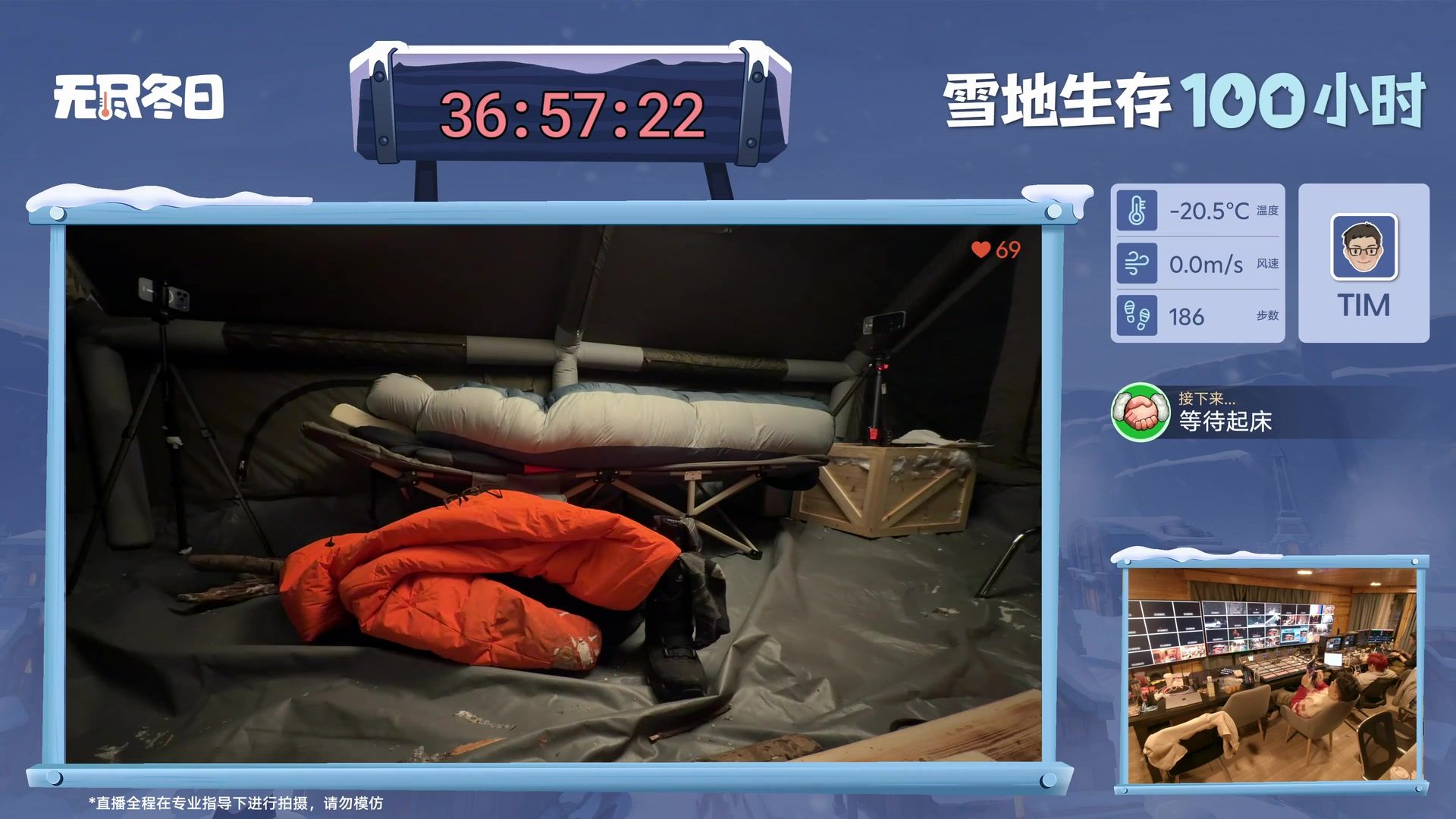 影视飓风Tim此次直播为1月23日开启的东北零下30℃雪地生存100小时挑战,该直播上线后曾吸引数万人在线围观。据了解,Tim雪地生存100小时挑战的直播嘉宾主要有四位,户外达人Links全程随行,何同学、中国BOY、李四维陆续空降助阵。